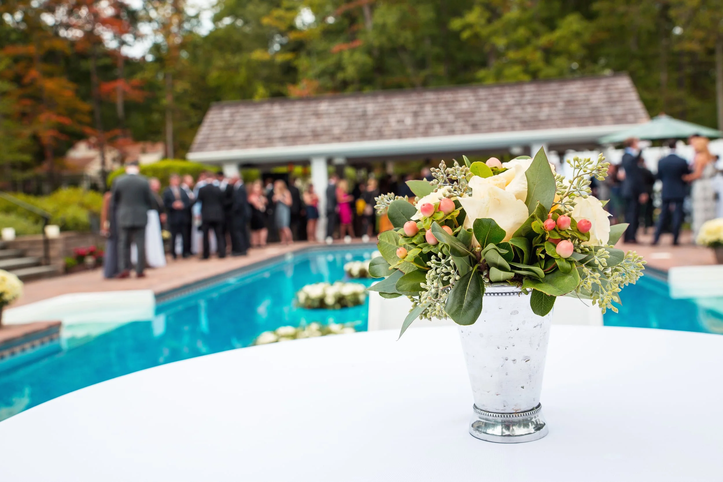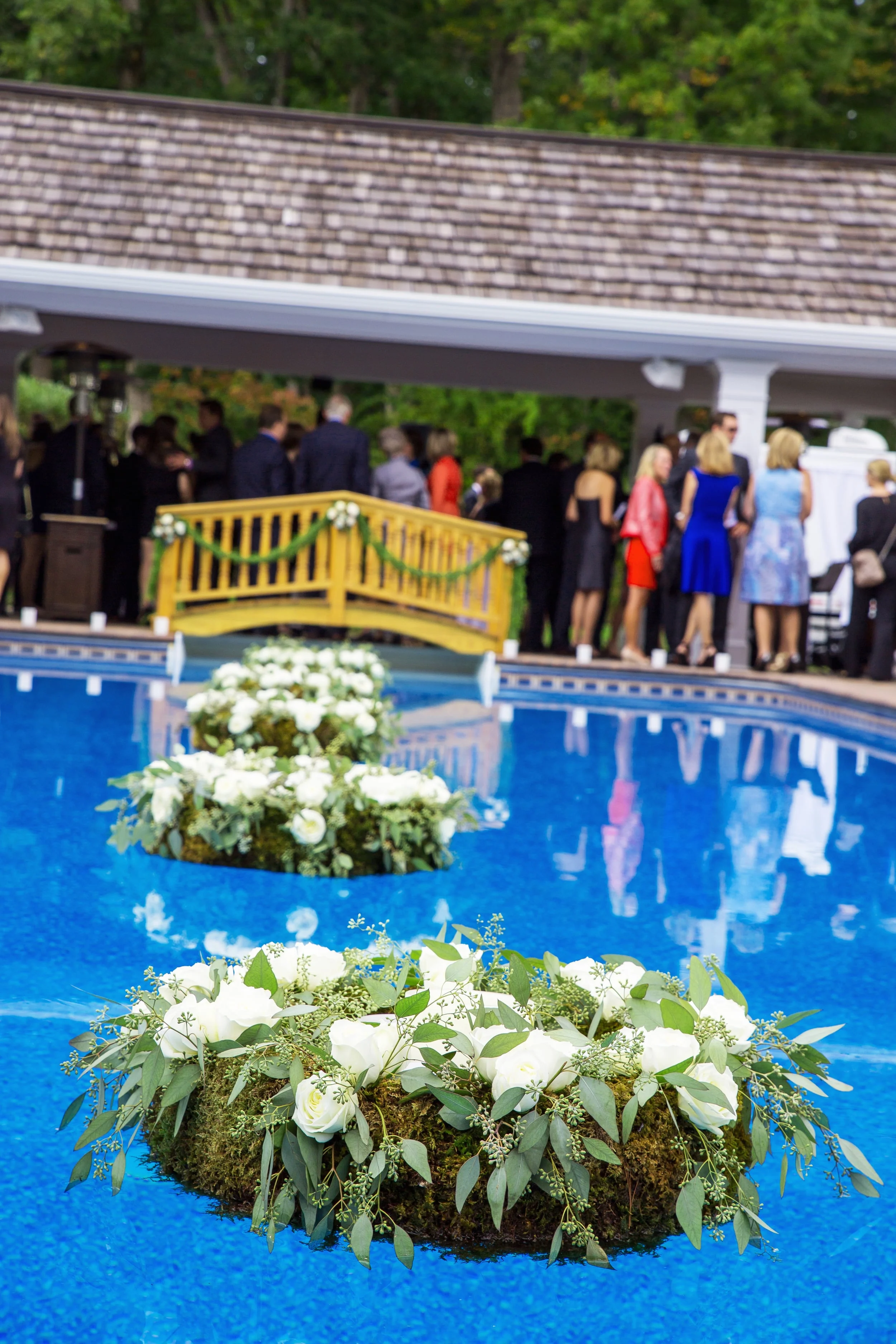 Pool Floats, white roses and greens in floating moss wreaths with candles in the center for added light later in the evening.
