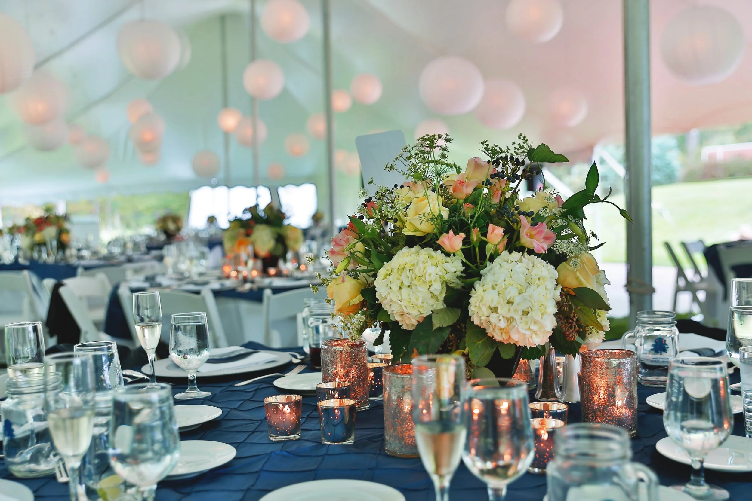 Table Shot, we did all the centerpieces over a navy pintuck overlay to give an element of elegance to the tent, we accented with silver mercury glass votives around the floral piece and finished by dressing the table with silver chargers and a square napkin fold with navy ribbon and grey lace, to pull the dress colors of the girls through the whole event.