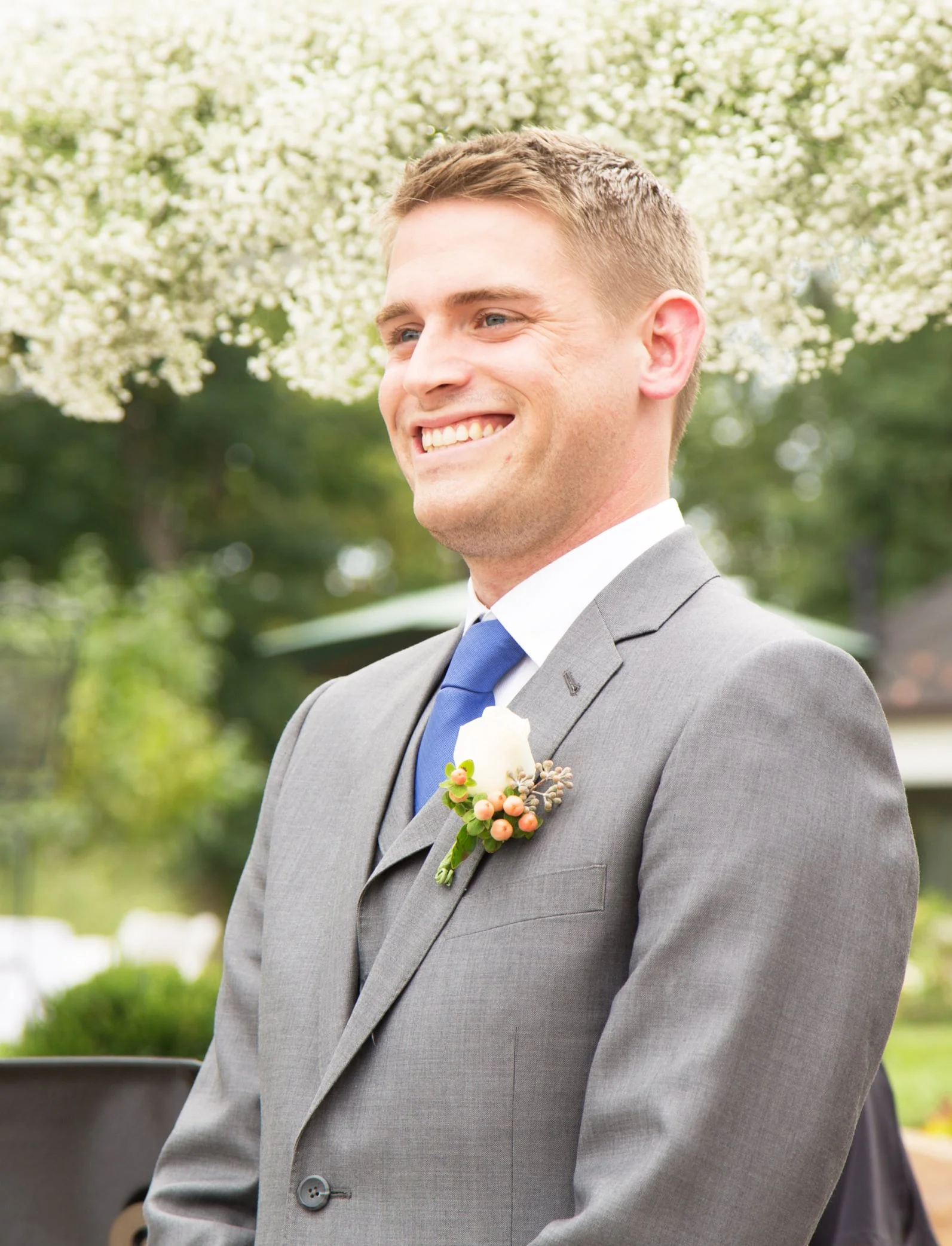 Groom Boutoniere, white rose with peach hypericum berry and eucalyptus, to match the bride's bouquet and a strong combo to last all day outside in what can be unpredictable temperatures,