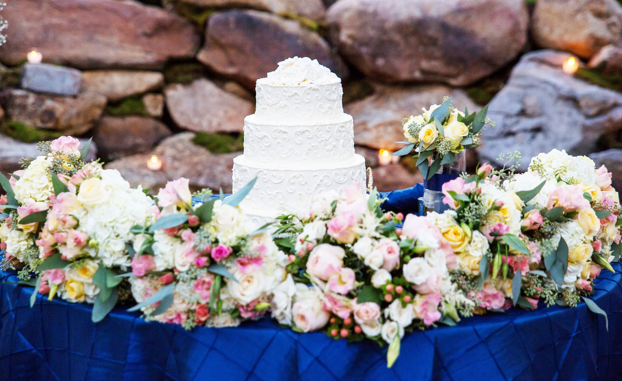Cake Table, again using the navy overlays and then simply using the bridal party bouquets to decorate the table.